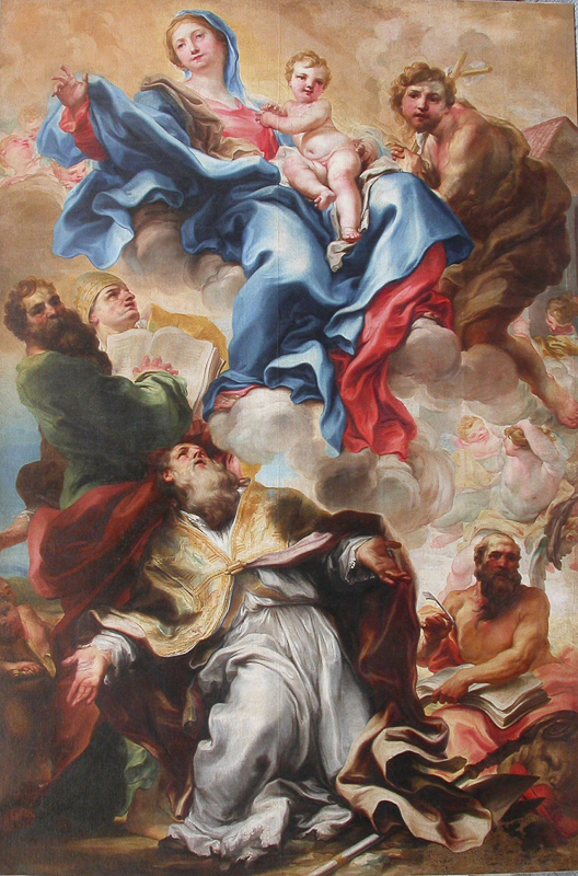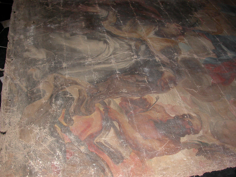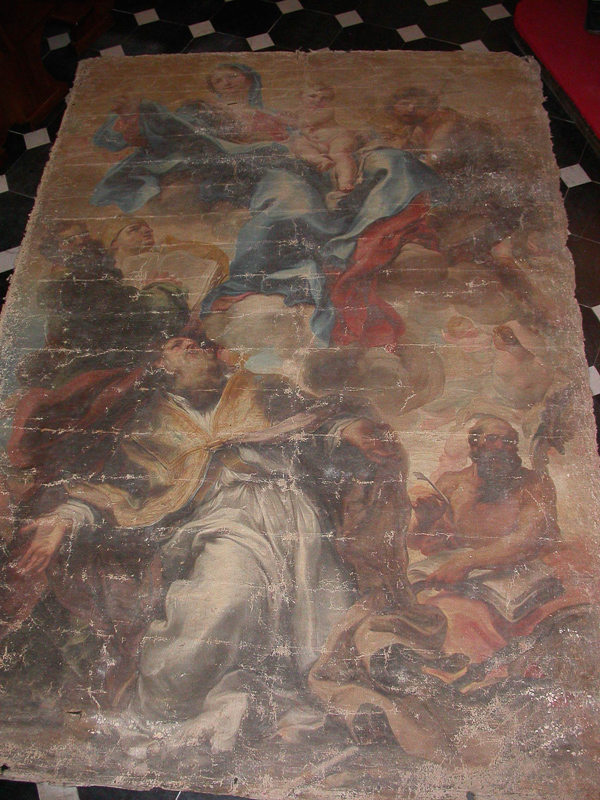 Era stata commissionata per l’altar maggiore della chiesa degli Agostiniani (tuttora esistente, anche se molto rovinata), ma era rimasta lassù per meno di un secolo. I religiosi, assai poco amati in paese, venivano espulsi nel 1797 dal regime filo-francese; e la pala di Gregorio era troppo emblematica per non essere coinvolta nella loro radicale damnatio memoriae. Non distrutta, ma tirata giù dall’altare: staccata dal telaio e “riposta”, per essere dimenticata.