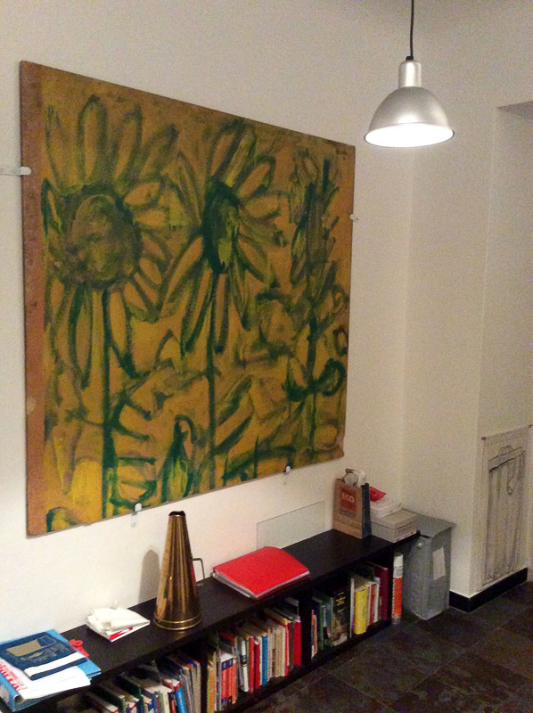 Sul catalogo della mostra del 2001 (Rocco non c’era più da sette anni), i Fiori verdi, non esposti, compaiono comunque. L’immagine, si vede chiaramente, compone due diverse riprese fotografiche; e nella didascalia, tant’è, ho fatto correggere la data. A casa, continuo a tenere i due dipinti su pareti vicine e distinte: cambio residenza piuttosto spesso, li ho già ambientati in quattro appartamenti diversi.