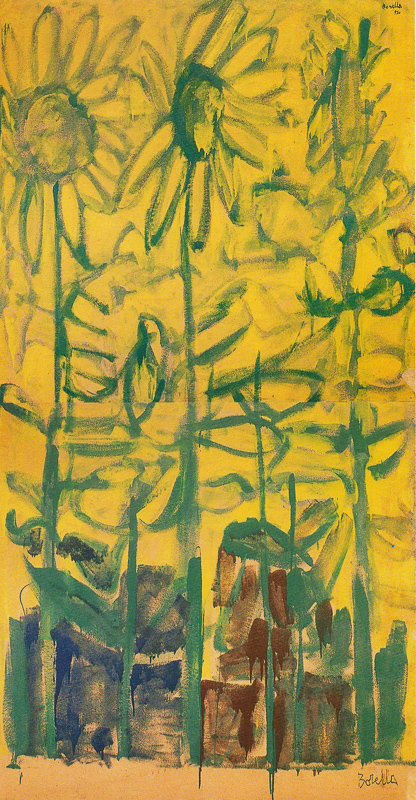 Lui mi richiama dopo qualche giorno e mi dice di venire senz’altro a prenderlo; la cosa, a quanto pare, sarebbe risolta. Di fatto – constaterò – ha segato con un flessibile i Fiori verdi, ricavandone due quadrati di un metro e mezzo per lato. “Nella metà di sopra restano le corolle, ma l’altra metà, che è fatta solo di gambi, adesso è un dipinto astratto.” Ha anche aggiunto una seconda firma, in alto a destra nella metà di sopra: così ora potrò dire di possedere due quadri. “Ma hai messo anche una data sbagliata, 1970 anziché 1990.” “Così diamo un po’ da fare alla critica.”