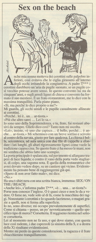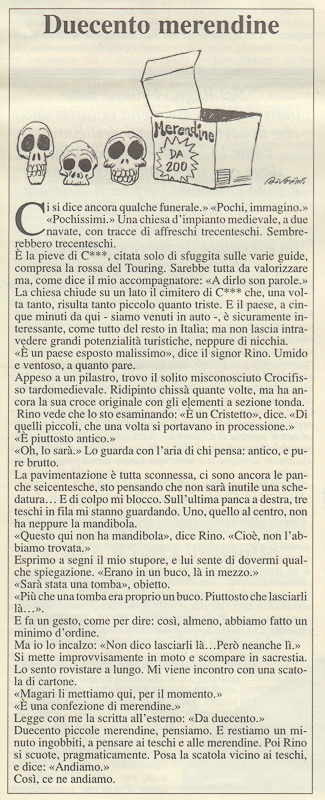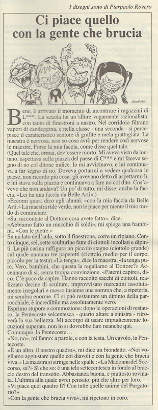 Ispirandomi a un noto testo di Luca Cavalli Sforza (Chi siamo?), mi divertivo, anni fa, a teorizzare la presenza di due diverse tipologie di storici dell’arte all’interno delle Soprintendenze: i pigmei e i bantù. Cacciatori-raccoglitori i primi, tendenzialmente propensi a un continuo movimento; agricoltori stanziali i secondi. Il pigmeo incarnava per me il tecnico di zona e la sua presenza mobile sul territorio, mentre nel bantù vedevo adombrato il conservatore del museo, con la “coltivazione” di un sito ben delimitato. La mia indubbia natura di pigmeo emerge da alcuni di bozzetti pubblicati nell’estate del 2005 sul “Giornale dell’Arte”. Umberto Allemandi aveva voluto corredarli di una serie di vignette, affidate a Pierpaolo Rovero.